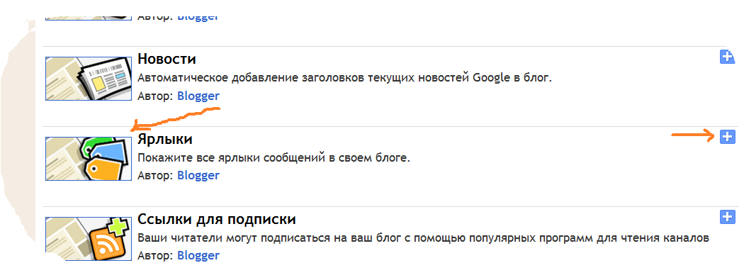 Проблема эта решается владельцем блога довольно просто. Заходим "Дизайн", "Добавить гаджет" и выбираем гаджет "Ярлыки":(картинки кликабельны)