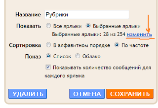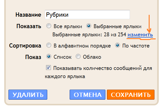 Выбрать название - "Рубрики", "Теги", Главное в блоге", как пожелаете. Я выбрал слово "Рубрики". Для того, что бы отражались не все ярлыки на странице блога, кликните(как показано на рисунке) - "изменить". Перед вами откроется новое окно